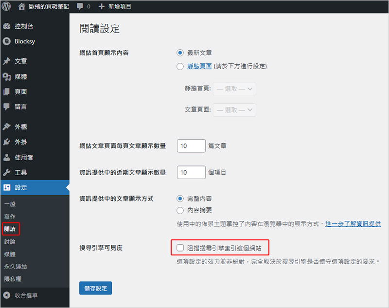 所以一開始先把這個「阻擋搜尋引擎索引這個網站」打勾。