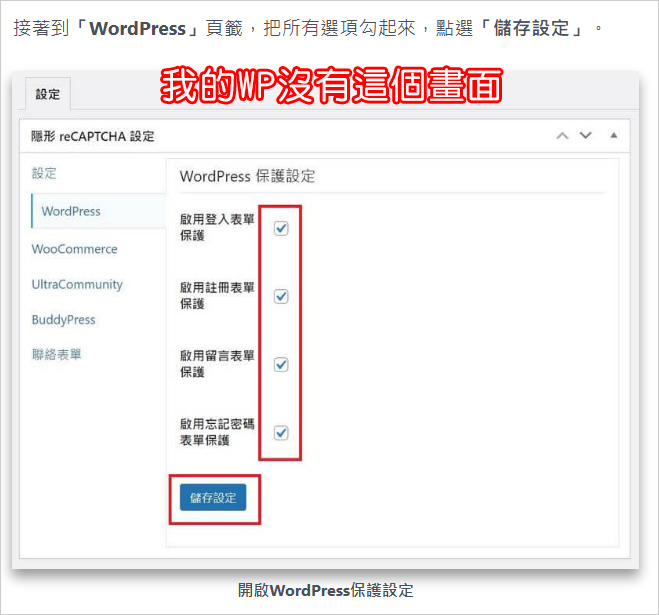 教學裡有一個畫面叫做「WordPress 保護設定」,但我的後台根本沒有這個畫面。
