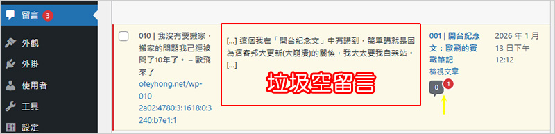 我1/12剛在歐飛先生公開我的自架站之後,很快就有網友來留言了,然後就會出現一些很奇怪的「空留言」。
