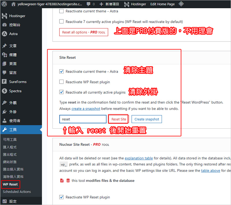 好,我就照著帶路姬的教學,實際操作了一次 WP Reset。