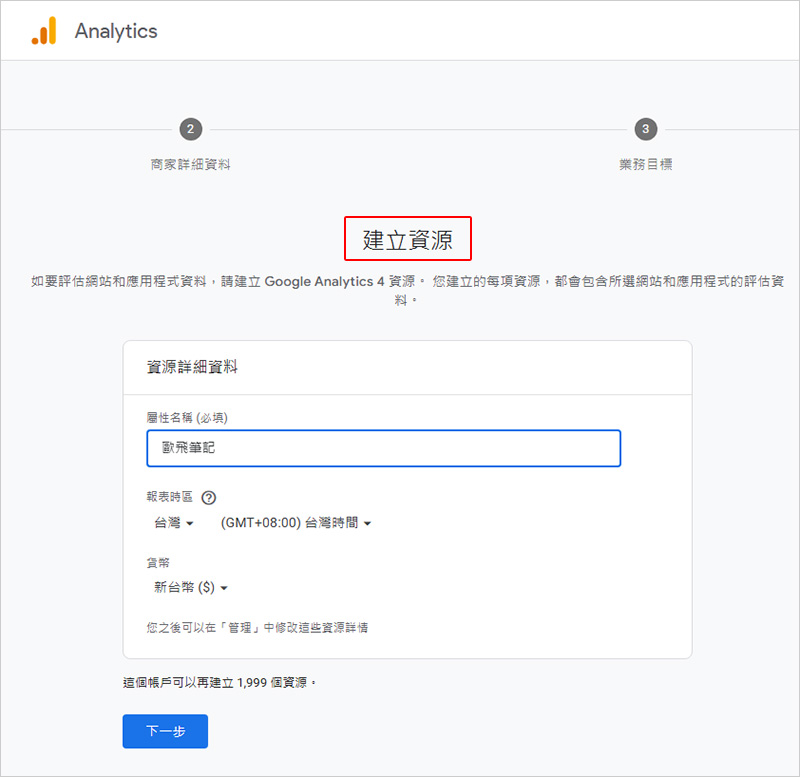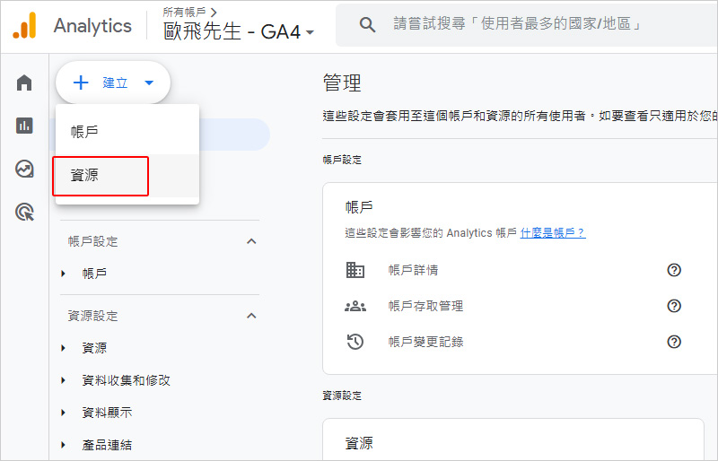 但不是建立新的「帳戶」,而是建立新的 「資源(Property)」 即可。