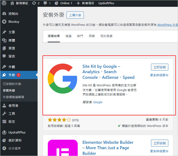 接著到 WordPress 後台 → 外掛 → 安裝「Site Kit by Google」。