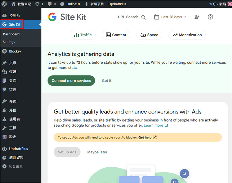 最後如果看到「Site Kit」的設定頁面,基本上就代表安裝成功了。