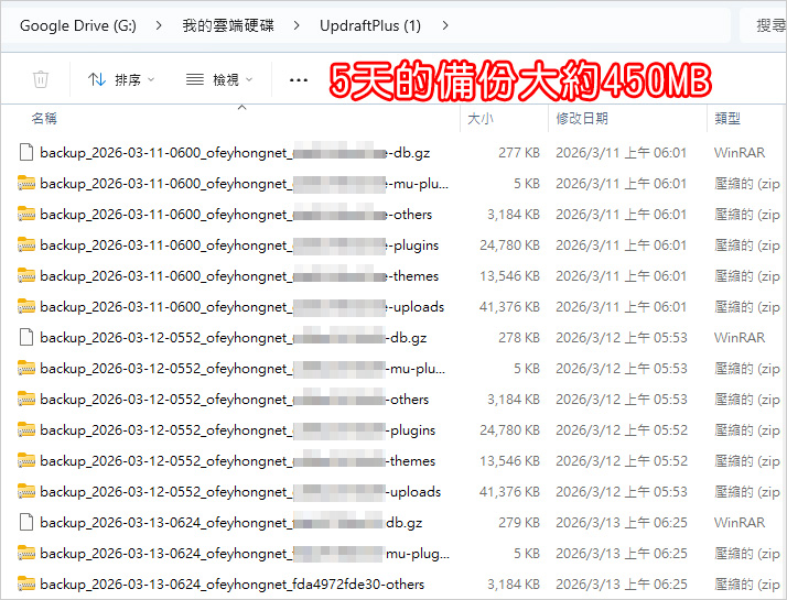 備份我這個網站,5天大約 450MB,平均一天大約 90~100MB。