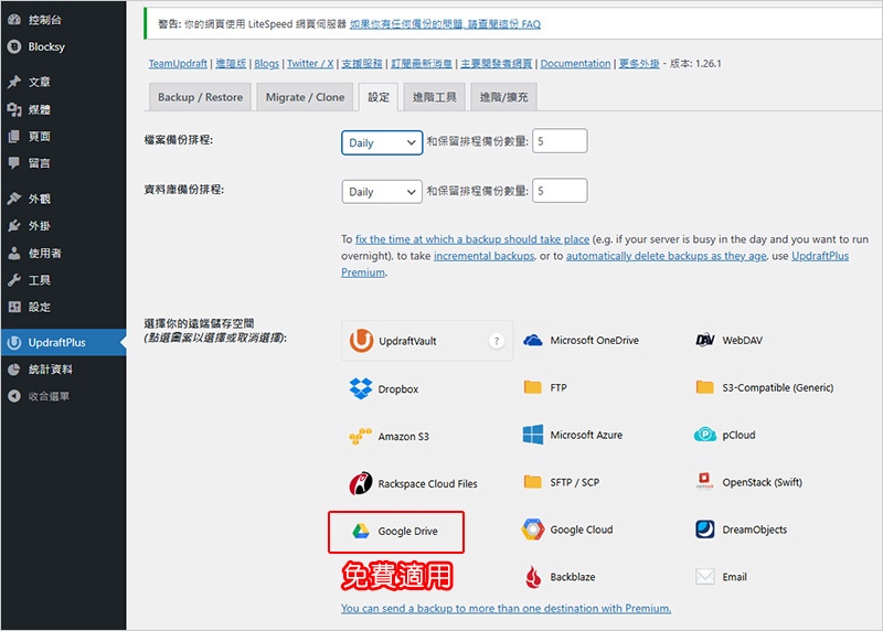 二、UpdraftPlus 這個備份外掛滿好用的,而且免費。