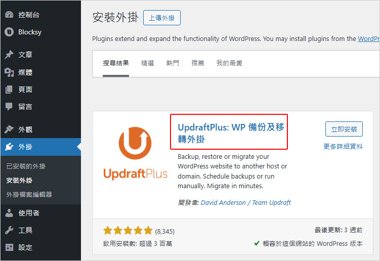 關鍵字:UpdraftPlus:WP 備份及移轉外掛