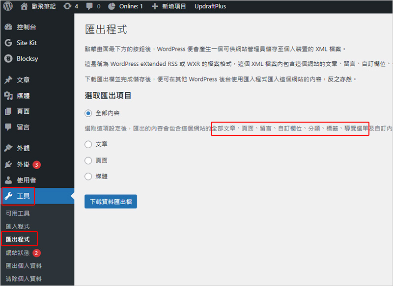 匯出只包含純文字,例如文章、留言、分類、標籤等。